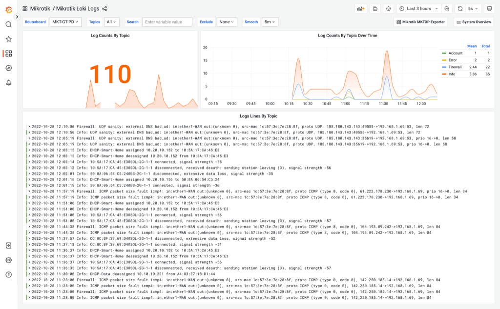 As soon as the containers are up & running, just point your Web browser to included Grafana dashboards and open the one called "Mikrotik Loki Logs".