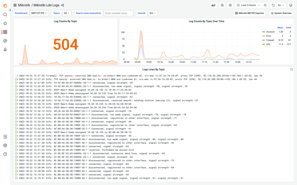 From there, point your Web browser to included Grafana dashboards and open "Mikrotik Loki Logs"